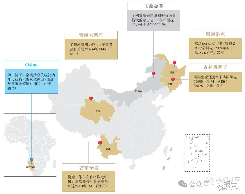 2024年,公司的黄金矿总产量在中国领先公司中排名第六,总矿产金产量达258.4千盎司。截至2024年,公司黄金储备总量达4.4百万盎司,在中国位列第四。