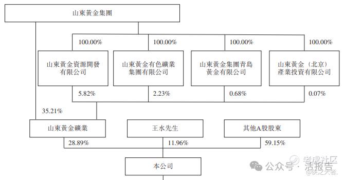 控股股东山东黄金(1787.HK/600547.SH)持股28.89%;王水先生持股11.96%;其他A股股东合计持股59.15%。