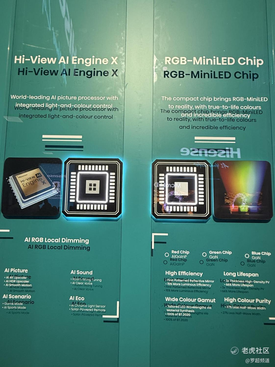 一个是决定RGB-Mini LED画质的全球首颗光色同控芯片信芯AI画质芯片H7,由海信自主研发。正如罗超Pro此前介绍,RGB这一概念并非海信提出,20年前索尼就探索类似的RGB-LED概念,然而在产品实现上始终无法解决光色同控和背光系统两大技术难点。信芯AI画质芯片H7攻克了光色同控的难题,其实现了行业可量产最高3x10240控色分区,实现行业最高108bits控色精度,确保画面更鲜活逼真,细腻度拉满。