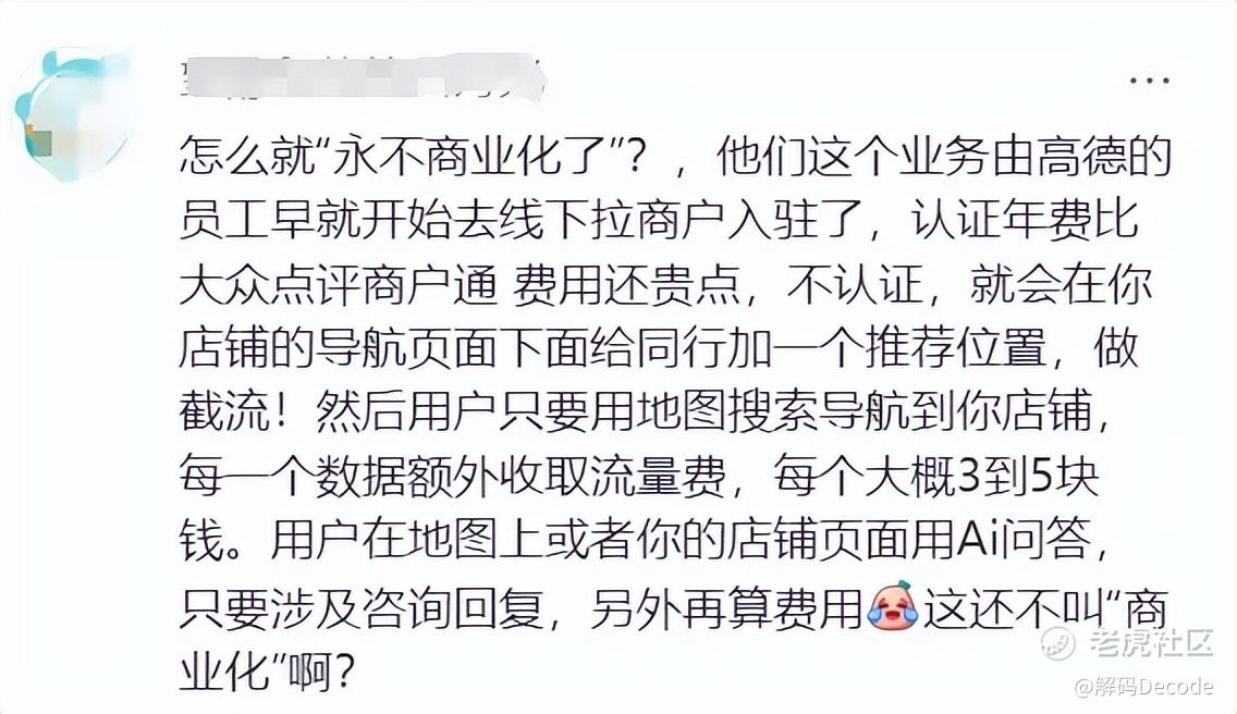 在地图里增加功能、转型“点评”赛道,高德加速商业变现的想法昭然若揭。包括宣布“永不商业化”的扫街榜,其实也是间接为商业化服务。网上有很多店主吐槽,每年要向高德缴纳入驻年费和推广费,不缴费就没流量甚至搜不到店铺。