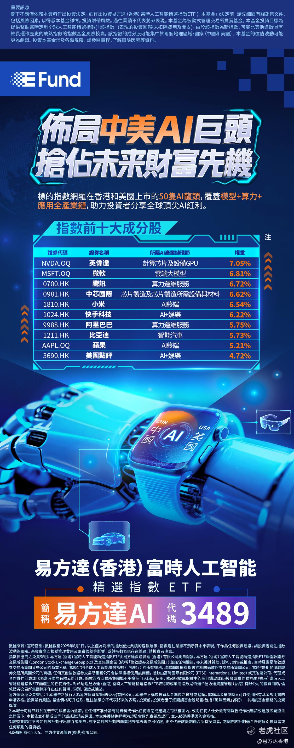 作为全球首支覆盖中美两地市场的 AI 主题 ETF,易方达 AI(3489)紧密跟踪富时定制全球人工智能精选指数,全面覆盖在香港、美国上市的人工智能全产业链核心标的,涵盖算力、算法、应用等关键环节,为投资者一站式、便捷把握全球顶尖 AI 企业的成长机遇,提供了高效的配置工具。