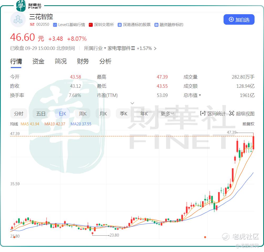 9月29日,A股的 $三花智控(002050)$ 大涨8.07%,股价创出历史新高,港股的 $三花智控(02050)$ 亦大涨8.62%。
