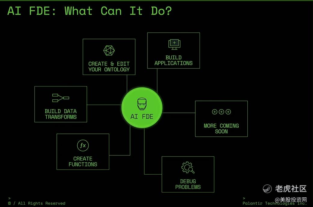 Palantir 一直以来与美国政府、军方、情报机构深度合作闻名,它的核心优势不是像 OpenAI 那样做最炫的 AI 模型,而是把 AI 真正落地到复杂、关键的任务场景中。所谓 AI FDE,本质上是 Palantir 打造的“代理 AI 技术”,能在企业或政府客户的实际运营中,快速定制化部署的 AI 代理。
