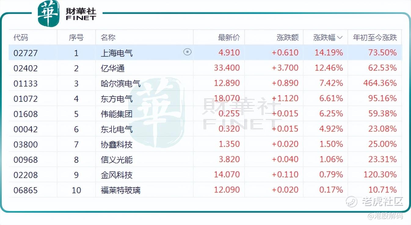 其中, $上海电气(02727)$ 大涨14.19%, $亿华通(02402)$ 上涨12.46%, $东方电气(01072)$ 涨6.61%, $哈尔滨电气(01133)$ 涨7.42%, $东北电气(00042)$ 涨4.92%,协鑫科技(03800.HK)、金风科技(02208.HK)等均纷纷飘红。