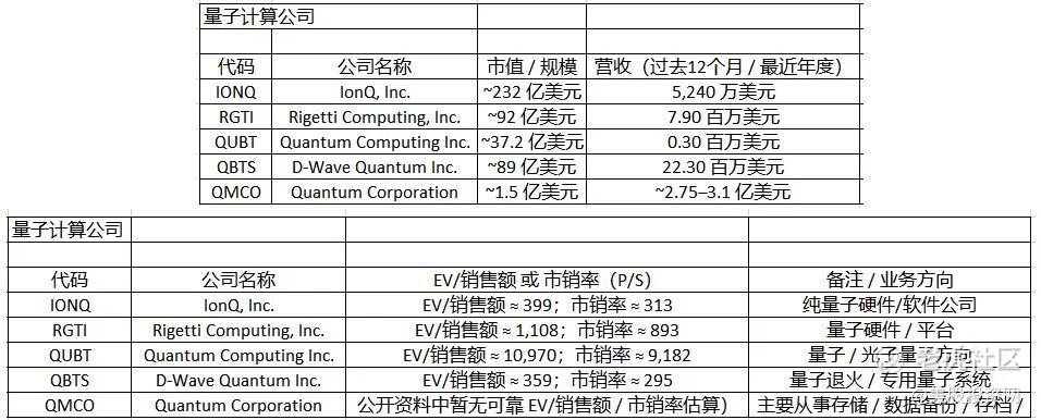所有公司目前均亏损严重,但估值仍然极高,显示市场对量子计算长期潜力的高预期。