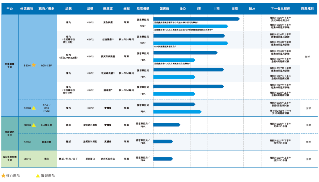 关键产品BS006是一种新一代创新型以HSV-2为病毒骨架的溶瘤病毒候选药物,融合了三重协同抗肿瘤机制,包括直接裂解肿瘤细胞以重塑肿瘤微环境、局部表达PD-L1/CD3双特异性TCE以活化和复位向T细胞,以及同时阻断PD-L1讯号传导。BS006已在美国进入I期临床试验,并成为全球首个进入临床开发阶段的TCE表达的HSV溶瘤病毒。在中国,其亦于2025年8月获得国家药监局的新药临床试验申请(IND)批准。
