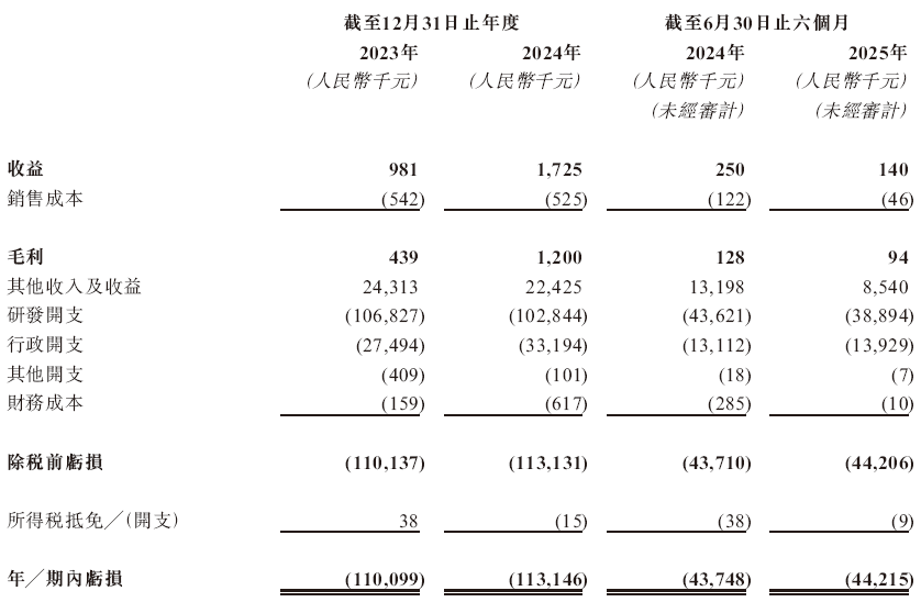 招股书显示,在过去的2023年、2024年和2025年前六个月,滨会生物的未有营业收入,相应的净亏损分别为人民币1.10亿、1.13亿、0.44亿和0.44亿元。