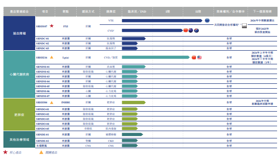 靖因药业正重点推进三大潜在重磅产品管线组合:凝血功能障碍类疾病、心脏代谢疾病与肥胖症,这些产品管线组合的布局由以下主力管线产品为代表: