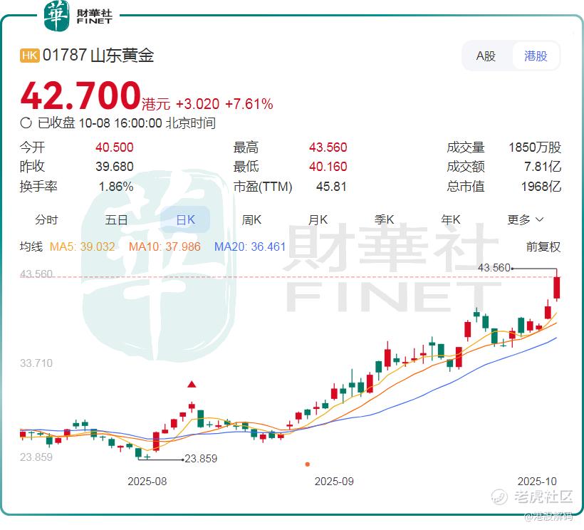 板块方面,由于国际黄金价格续创历史新高,港股黄金股大涨, $山东黄金(01787)$ 四个交易日内大涨超15%, $紫金矿业(02899)$ 涨超5%。