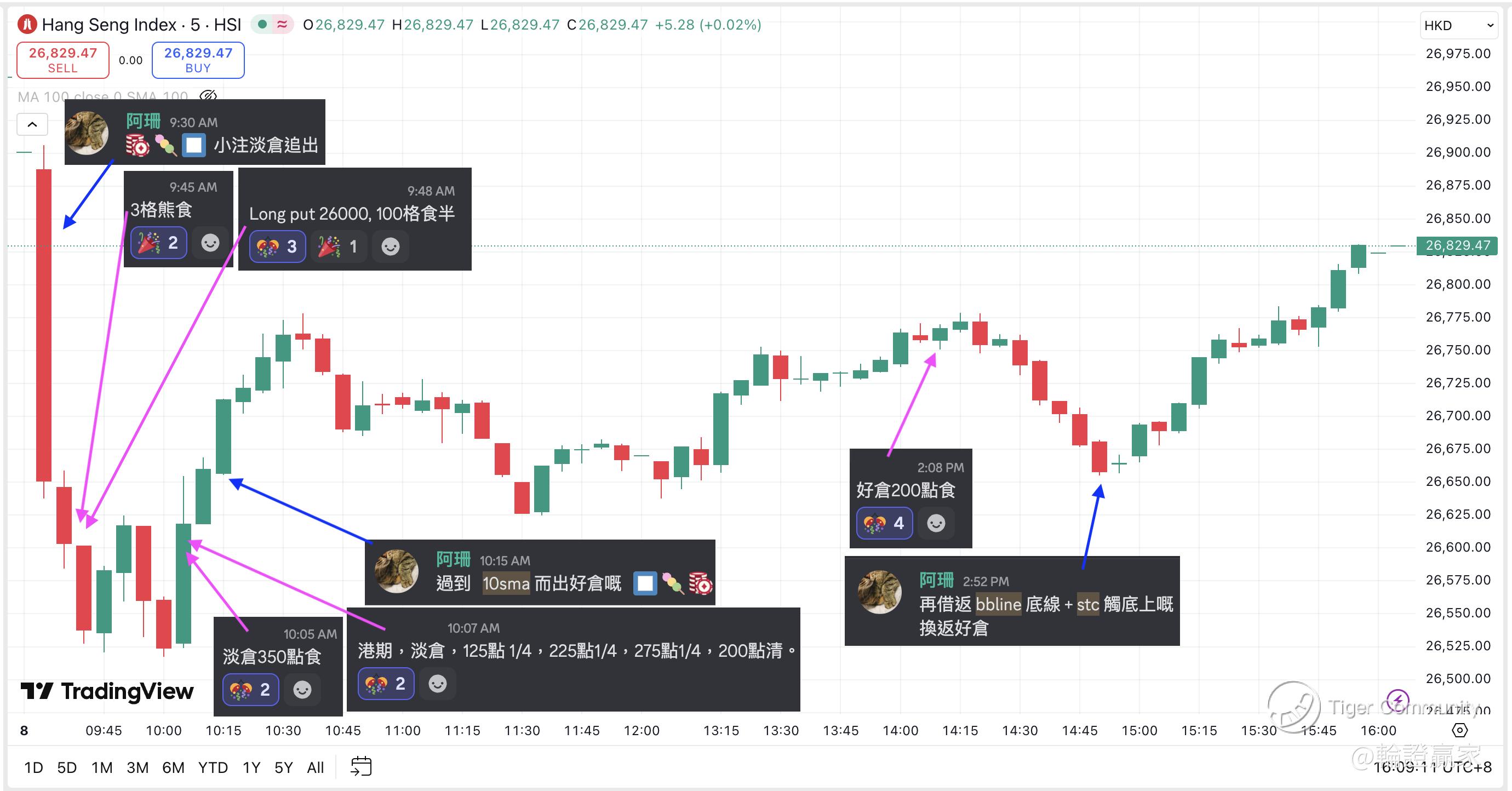 至于 $HSI(HSI)$ 就高开(?!)3X点之后即向下落,灯都即转,作战室今朝第一注淡仓掟咗出去之后见第一层重货牛终于都清晒,同步五分钟图上见指数低位出「锤头」+Slow STC(14.3)触底上,作战室全线反手好仓,到依家10点20分,连注好仓都准备收工/出风筝策略。