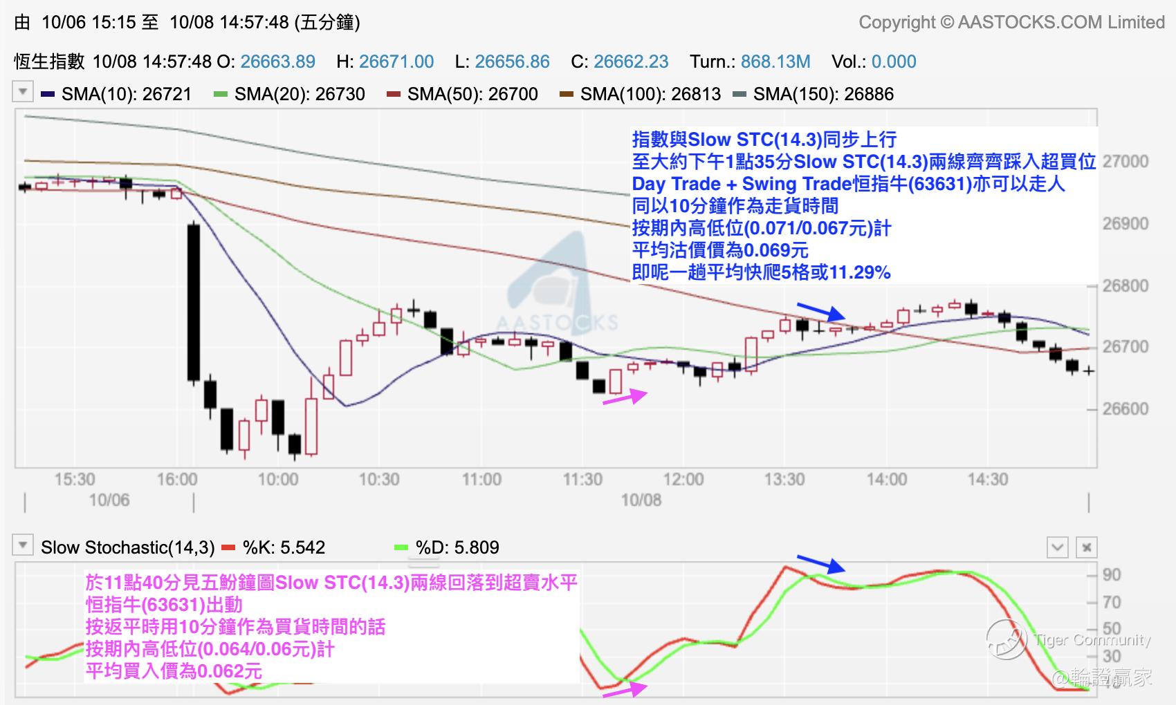 今朝拣咗只 $UB#HSI RC2710O.C(63631)$ 出嚟,纯綷借五分钟图Slow STC(14.3)出Swing trade + Day Trade用咋,唔好谂到咁大咬同咁复杂。