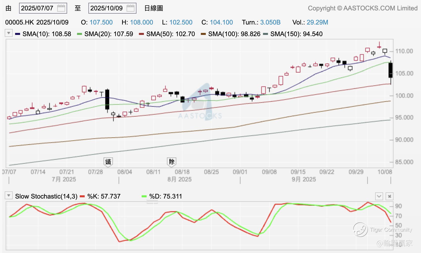 至于汇控,依家9点44分见股价跌近6%报104蚊。亦都合理,先是通告里面讲明汇控喺未来三个月会停回购、而本身恒生PB都唔低,再出溢价买佢返嚟(系需要架,你唔比多少少人哋点解要卖比你?!)即系比劲高估值嚟买恒生返嚟。咁嘅情况之下汇控今日呢个跌幅,其实系合理,反过来又系唔系一个值得吸纳嘅时机呢?!等多一两日先啦,至少睇吓佢条50天线接唔接得实先啦,唔好忘记佢条Slow STC(14.3)唔低架。