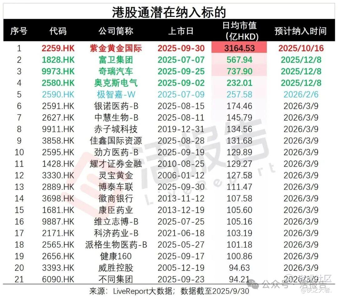 据LiveReport大数据预测,截至2025年9月30日,银诺医药-B、中慧生物-B、赤子城科技、佳鑫国际资源、劲方医药-B、耀才证券金融、灵宝黄金、博泰车联、徽商银行、康臣药业、维立志博-B、科济药业-B、派格生物医药-B、健康160、威胜控股、不同集团等16只股票有望于2026年3月9日纳入港股通。