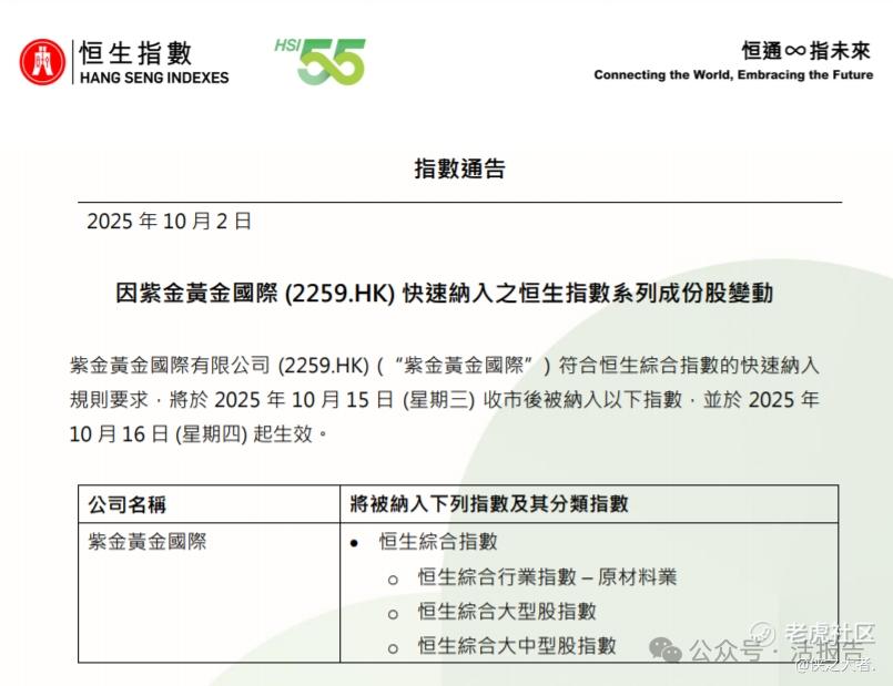 不出所料,10月2日,恒生指数公司官方发布公告,紫金黄金国际符合恒生综合指数的快速纳入规则要求,将于10月15日收市后被纳入恒生综合指数及其相关分类指数,并于10月16日起生效。