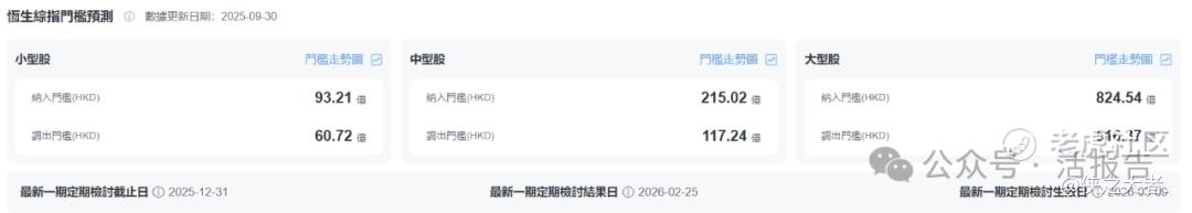 针对下一次定期检讨,据LiveReport大数据测算,截至2025年9月30日,港股上市公司进入恒生综合指数及港股通的市值门槛约为93.21亿港元,剔除恒生综合指数及港股通的市值警戒线为60.72亿港元。