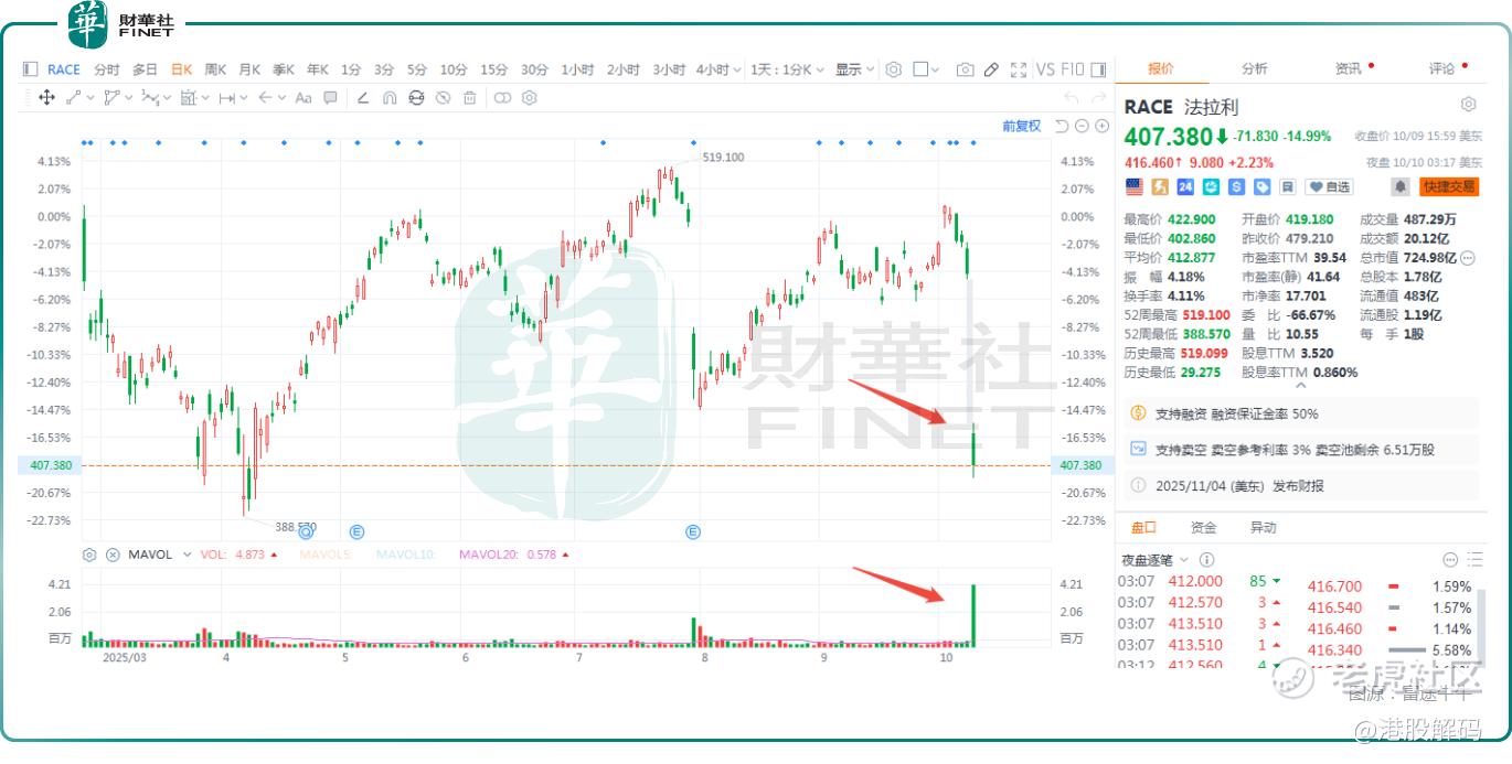 10月9日(均指当地时间),豪华汽车品牌 $法拉利(RACE)$ 遭遇爆量下挫,其股价跳空大跌了14.99%。