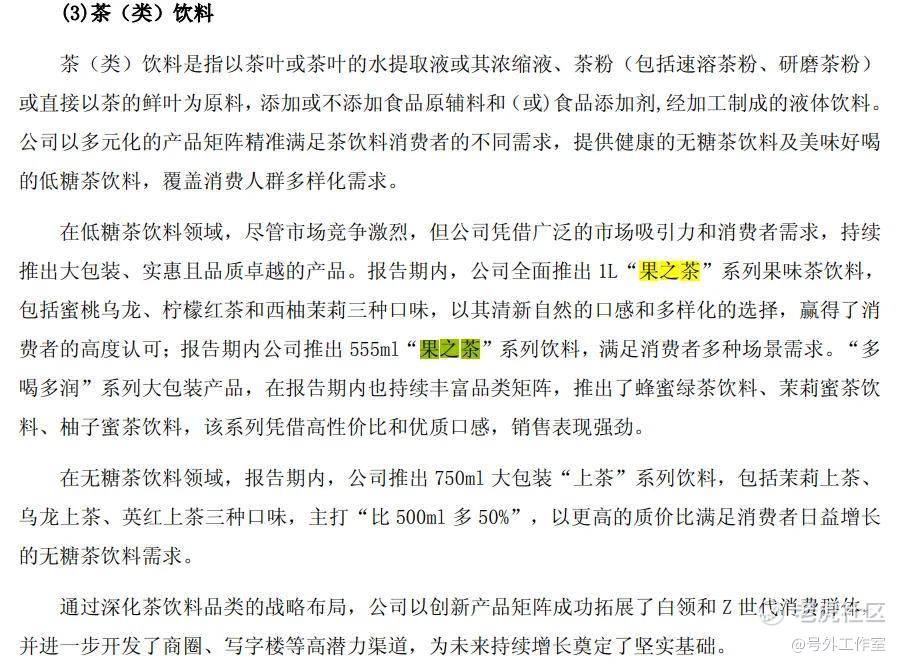茶饮料方面推出果之茶与上茶,其中,果之茶主打真果汁和现泡茶底、1L家庭装,上茶定位无糖、750ml装。