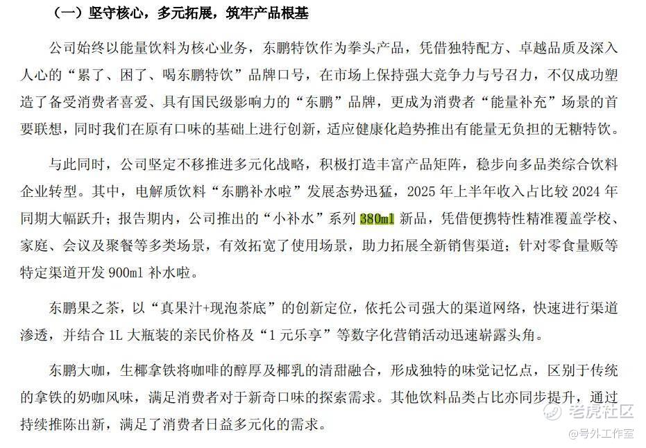 最新的2025年半年报显示,东鹏特饮占比降至77.91%,电解质饮料东鹏补水啦占比13.91%,茶、咖啡等合计占比8.18%,这种1+6的产品矩阵成效显著,更侧重健康化创新与场景化细分。