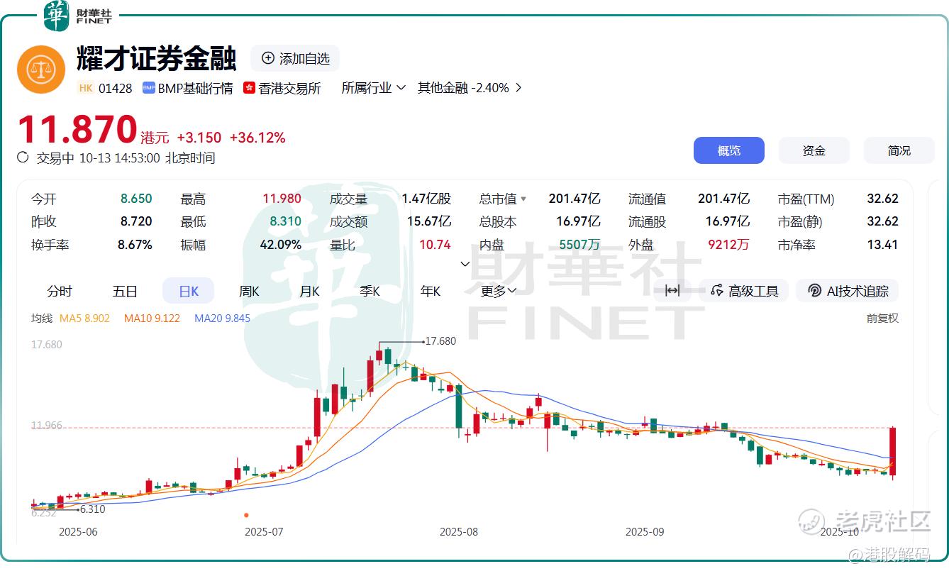 10月13日, $耀才证券金融(01428)$ 午后股价上演“狂飙”大戏,截至发稿前,该股涨幅达36.12%,报11.87港元/股,位居港股涨幅榜前列。