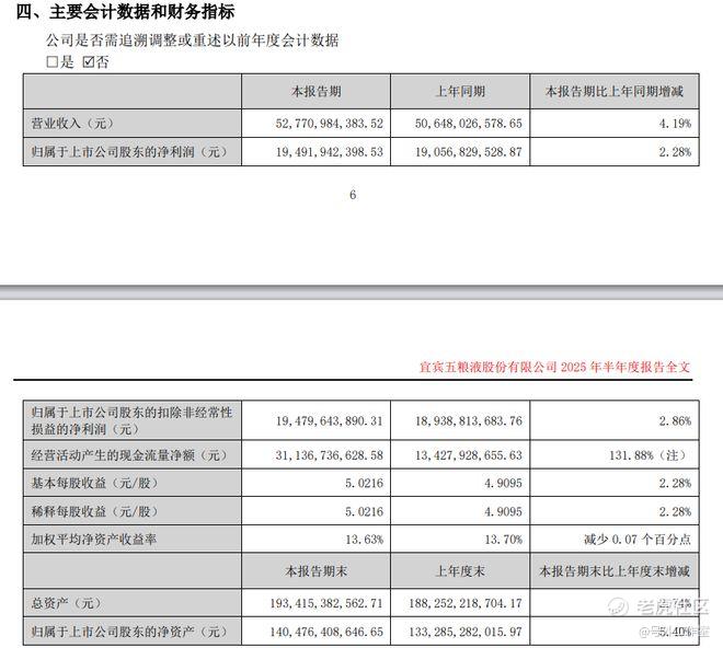 宜宾五粮液2025年半年度报告于8月28日正式披露。据财报显示,五粮液上半年实现营业收入527.71亿元,同比增长4.19%;归属于上市公司股东的净利润194.92亿元,同比增长2.28%,依旧保持着稳健增长的态势,似乎在高端白酒行业竞争中稳固了自身地位。