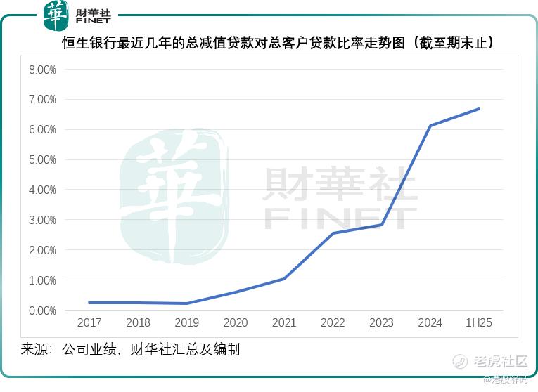 2025年上半年,恒生银行的预期信贷损失变动及其他信贷减值拨备增加33.61亿港元,达到48.61亿港元,其中25.40亿港元来自香港商业房地产。由于房地产行业持续面临信贷压力,其不良贷款比率持续攀升,于2025年6月末已达到6.69%的水平,见下图,恒生银行的总贷款减值准备从2021年起大幅飙升,主要还是受香港商业地产下滑所影响。