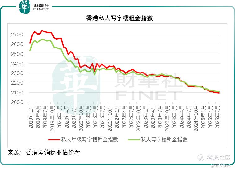 受香港本地消费结构变化、游客消费模式转移、贸易摩擦等影响,本地商用物业的租金回报、售价都出现下滑,见下图,甲级写字楼租金指数持续下滑。