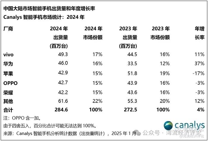 2024年全年,vivo、**、苹果、OPPO、荣耀分别占据中国大陆市场智能手机出货量前5。4个国产品牌共赢得63%的市场份额。