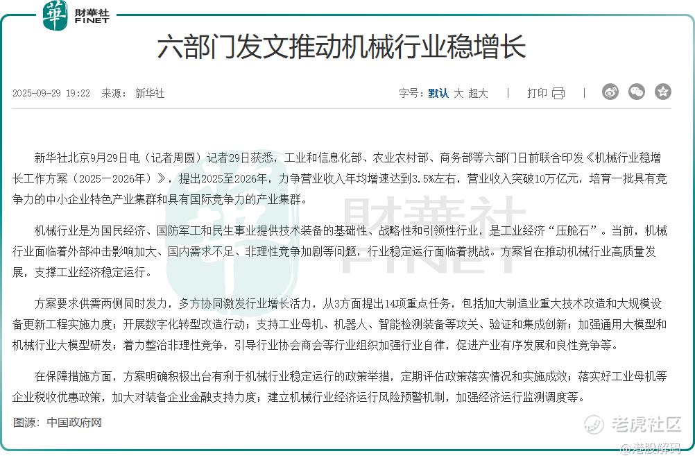工信部等六部门近期联合印发的《机械行业稳增长工作方案(2025-2026年)》提出,将从四个方面全方位扩大行业有效需求:一是推动行业稳增长,目标机械行业营业收入年均增速达3.5%左右,到2026年突破10万亿元;二是推进大规模设备更新,激活老旧设备置换需求;三是促进技术转型与创新发展,包括电动化、智能化转型;四是持续深化海外布局。