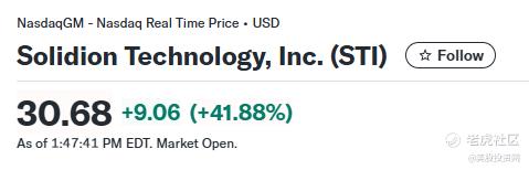 今天电池与 UPS 领域的新玩家 $Solidion Technology Inc.(STI)$ 连续两日爆发性上涨,在昨日飙升 350% 的基础上,今日盘中再次狂飙 41.88%。
