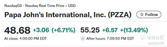 全球第三大披萨外卖连锁品牌 $棒约翰(PZZA)$ 盘后飙升 13.49%,原因是阿波罗全球管理公司正式提交了每股 64 美元的收购报价。