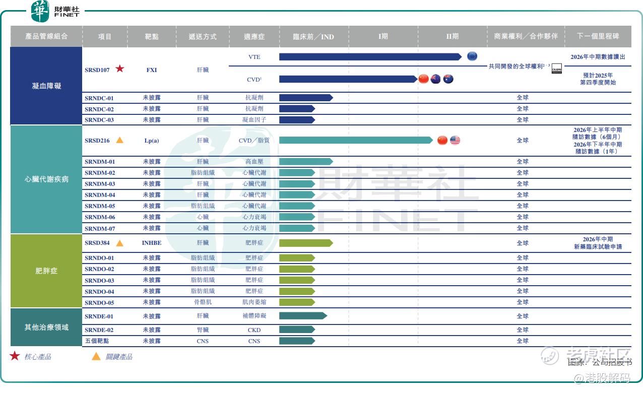 1)核心产品SRSD107:一款潜在同类首创的靶向凝血因子XI的siRNA药物,目前正于欧洲开展VTE II期多中心临床试验,并计划在中国及澳大利亚/新西兰启动CVD II期试验。