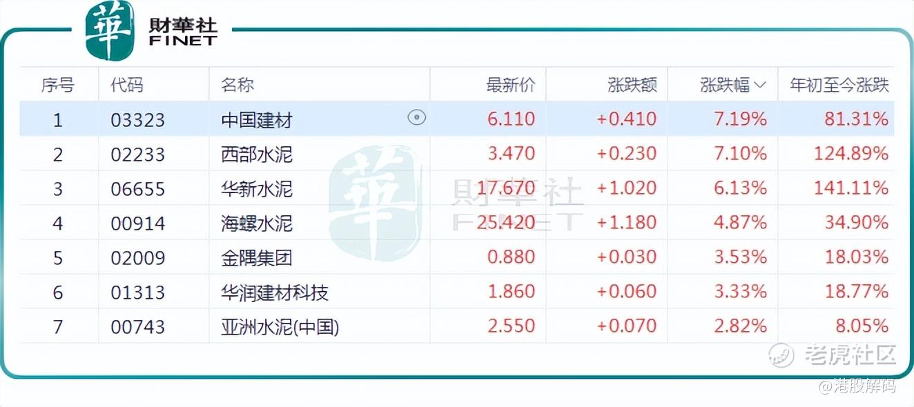 在港股市场,截至发稿前, $中国建材(03323)$ 表现最为突出,涨幅为7.19%; $西部水泥(02233)$ 紧随其后,上涨7.1%; $华新水泥(06655)$ 涨6.13%, $海螺水泥(00914)$ 涨4.87%, $华润建材科技(01313)$ 跟涨。