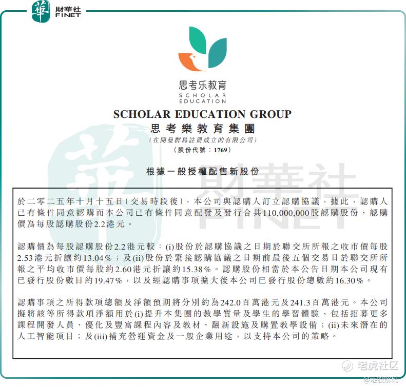 10月15日,港股的 $思考乐教育(01769)$ 抛出了一份“折价配售”计划,拟以13.04%的折价幅度,配售1.1亿股新H股,净筹资约2.41亿港元。