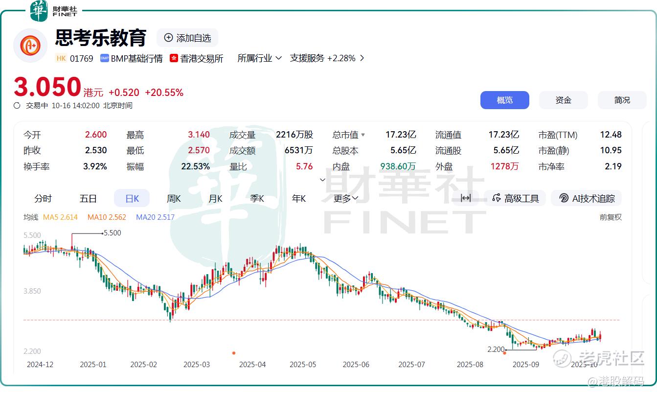 10月16日,思考乐教育股价大幅飙升,截至发稿前,该股涨幅达20.55%,报3.05港元/股。