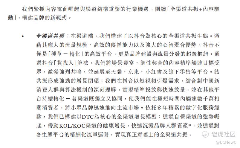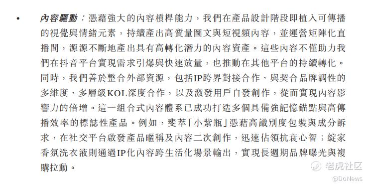 与此同时,其还注重内容驱动,其在招股书中指出,“凭借强大的内容杠杆能力,我们在产品设计阶段即植入可传播的视觉与情绪元素,持续产出高质量图文与短视频内容,并运营矩阵化直播间,源源不断地产出具有高转化潜力的内容资产。这些内容不仅助力我们在抖音平台实现需求引爆与快速放量,也推动在其他平台的持续转化。”