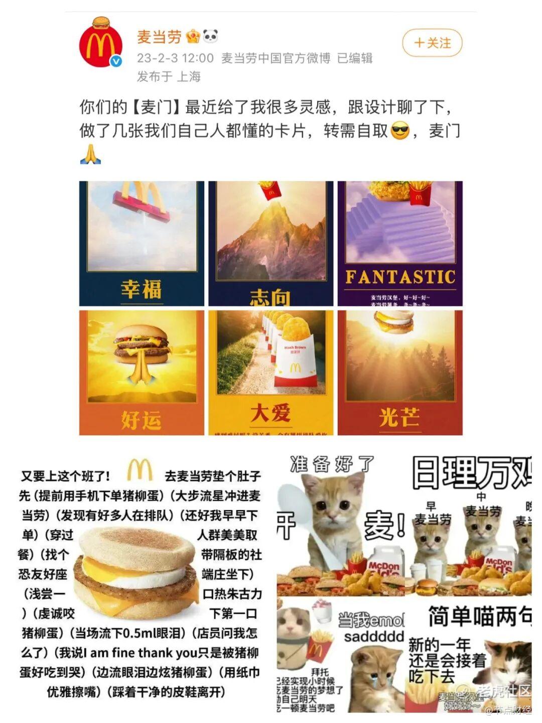 有人说,心情不好的时候,除了倒立防止眼泪流下来,还可以去刷刷麦当劳的官号,那里堪称当代网友的“电子快乐老家”,账号运营“带薪网上冲浪”,张口就是梗,出手就是段子,正是这种“认真陪你疯”的互动姿态,让麦当劳从一家快餐品牌,升格为一种青年文化现象。