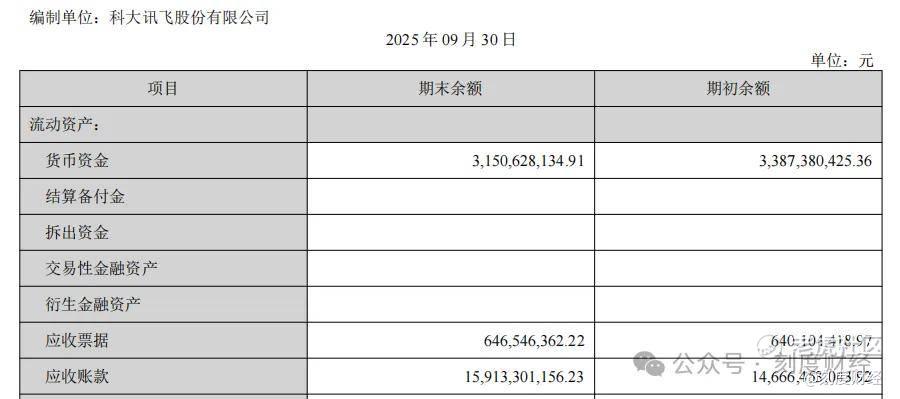 截至2025年三季度末,科大讯飞应收账款余额高达159.13亿元,较期初的146.66亿元增长8.50%,这一数字已接近前三季度169.89亿元的营业收入总额,占比达到93.66%。