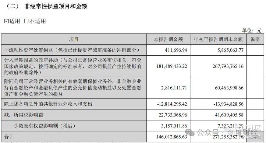拆解非经常性损益构成可见,政府补助是绝对主力。第三季度单季政府补助金额1.81亿元已超过当期非经常性损益总额1.46亿元,年初至报告期末政府补助累计2.68亿元,占非经常性损益总额的98.9%。