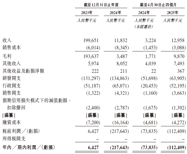 招股书显示,在过去的2023年、2024年和2025年前四个月,旺山旺水的营业收入分别为人民币19,965.1万、1,183.2万和1,295.8万元,相应的研发开支分别为人民币1.31亿、1.35亿和0.64亿元,相应的净利润分别为人民币642.7万、-2.18亿和-1.12亿元。