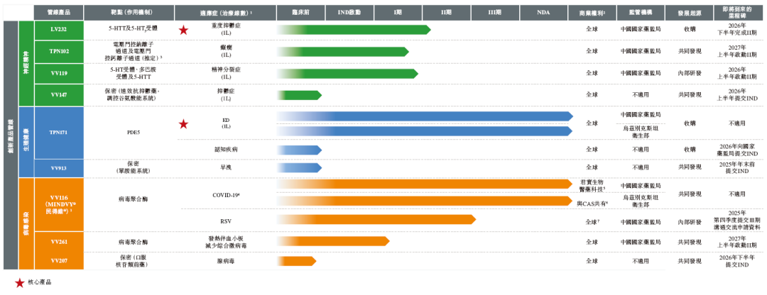 VV261(一种针对病毒RdRp的广谱抗病毒核苷类前药)、TPN102(一种治疗癫痫的电压门控钠、钙离子通道抑制剂,靶向抑制全身性及局灶性的癫痫发作)、VV119(一种用于治疗精神疾病(尤其是精神分裂症)的独立开发的多靶点血清素-多巴胺活性调节剂)、VV207(一种具有新型结构的口服核苷类前药)、VV147(治疗抑郁症)、VV913(一种新型结构的小分子,设计用于治疗早泄)。