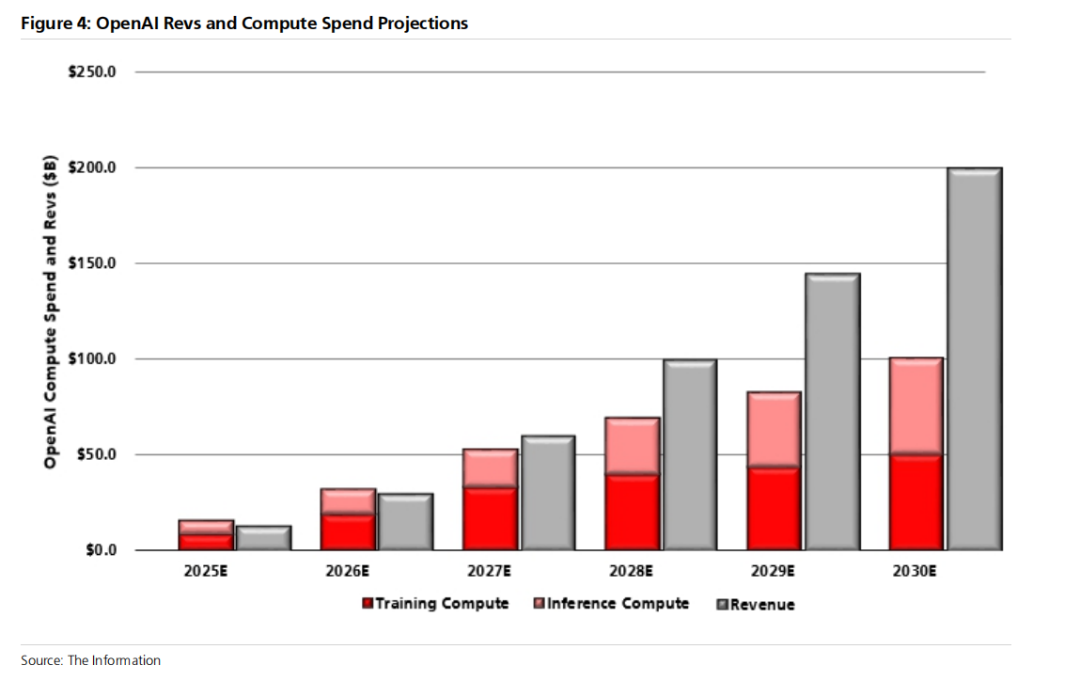 虽然直接与外部云基础设施提供商达成的交易对云基础设施提供商(至少对Oracle、CoreWeave和Google而言)非常利好,但OpenAI与英伟达、AMD和博通签订的硬件协议,提高了OpenAI也将建设专有GPU数据中心来容纳这些硬件的可能性。投资者担忧此举可能会削弱Microsoft、Oracle和CoreWeave的增长潜力,和/或导致结构上更低的定价以及更低的AI计算毛利率结构。这些担忧是合理的,但最终,我们持更建设性观点的关键在于,即使OpenAI建设专有数据中心,云基础设施提供商能够从五大模型提供商那里获得的计算支出规模依然巨大。如下文图4所示,仅OpenAI一家就计划在2030年花费1000亿美元用于训练和推理计算。在所有模型提供商中,这很可能会达到每年2000至3000亿美元的规模。相对于AWS、Microsoft Azure和Google Cloud现有的2650亿美元年化收入运行率,这是未来5年内即将出现的巨大新市场规模。