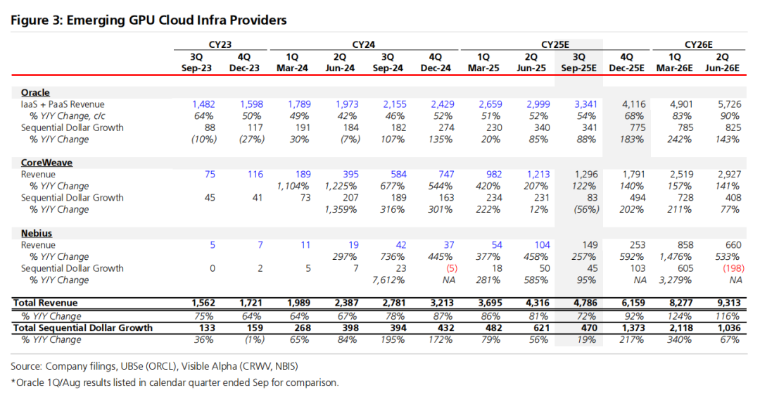 虽然我们本季度云基础设施预览的重点是"三大"云厂商,但对以GPU为中心的基础设施的非凡需求,反映在了一系列新兴云基础设施提供商的出现上,这些提供商以GPU(尤其是英伟达)为中心,其中许多部分由英伟达资助。甲骨文是迄今为止新进入者中规模最大的,其他还包括公开上市的CoreWeave和Nebius,以及私人控股的Lambda Labs、Together和Crusoe(以及一长串较小的提供商)。因此,我们以及微软、亚马逊和谷歌的投资者正日益关注这些云提供商的表现,将其作为超大规模云厂商对AI/GPU需求健康程度的参考指标。在图3中,我们分别展示了这些上市公司的历史业绩以及市场预期。我们未将这些业绩与"三大"的业绩相加,因为大多数新兴GPU云提供商(包括甲骨文、CoreWeave和Lambda)是"三大"云厂商(特别是微软)的分包商。将它们的业绩与"三大"的表现相加会导致重复计算。归根结底,这3家上市的"GPU云"公司的业绩强化了一种观点,即GPU需求(主要来自模型提供商,但也包括AI初创企业和传统企业)依然非常旺盛。这些新兴的以GPU为中心的提供商在最近一个季度的综合增长率为81%,环比增长创下纪录。重要的是,市场预计(很大程度上因为公司如此指引)甲骨文云基础设施、CoreWeave和Nebius在2025年第四季度的增长率将加速。