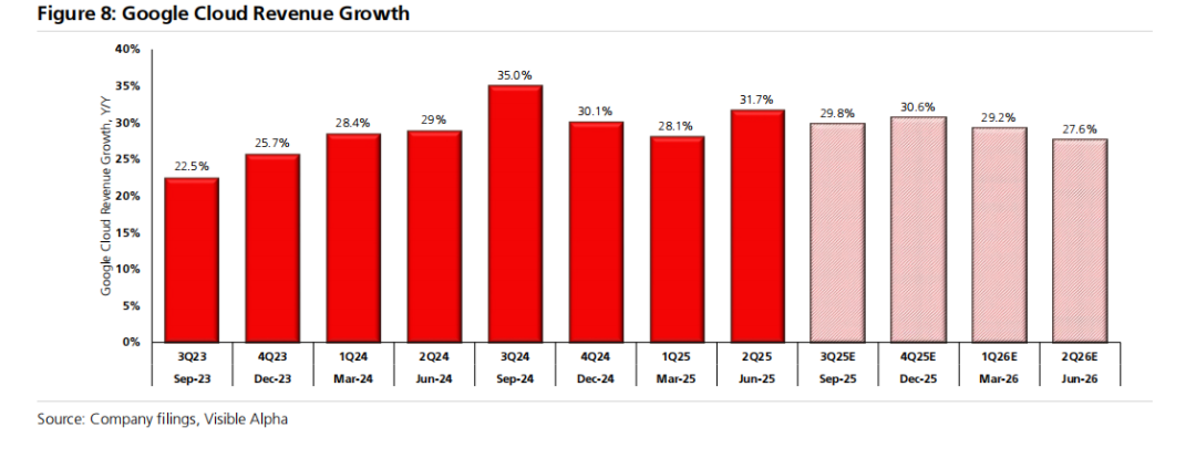 尽管华尔街共识预期2025年第三季度增长率将放缓2个百分点至30%,这意味着环比美元增长为11亿美元,但这仅比去年同期的2024年第三季度的10亿美元环比增长略有改善。考虑到整体云基础设施增长非常健康的基调,以及谷歌自有Gemini模型应用可能带来的持续强劲拉动效应,在我们看来,这一30%的增长预期存在上行潜力。