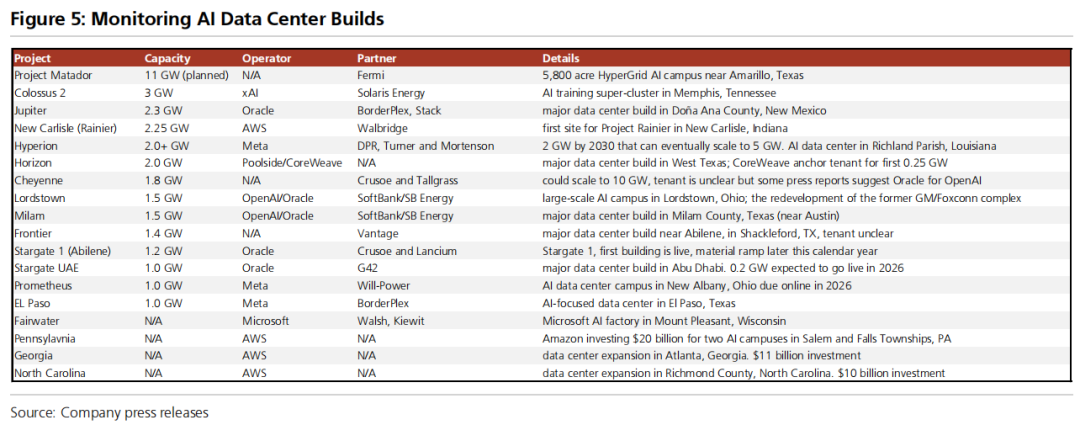 亚马逊、微软、谷歌、甲骨文和CoreWeave与五大模型提供商签订实质性多年期协议是一回事。而要让这些云服务提供商成功部署足够的AI计算算力以履行这些承诺,则是另一回事。功耗超过1吉瓦的AI数据中心建设周期长达数年,且在整个过程中面临一系列上线风险(包括芯片供应、电力和电气设备短缺,更不用说劳动力限制和地方反对意见)。密切监测大型AI数据中心的建设进展,将其作为从英伟达到甲骨文等公司预测的输入依据,将变得愈发重要。截至目前,我们尚未发现任何重大的上线限制因素,会导致我们需要调低对云基础设施提供商的AI收入预估。
