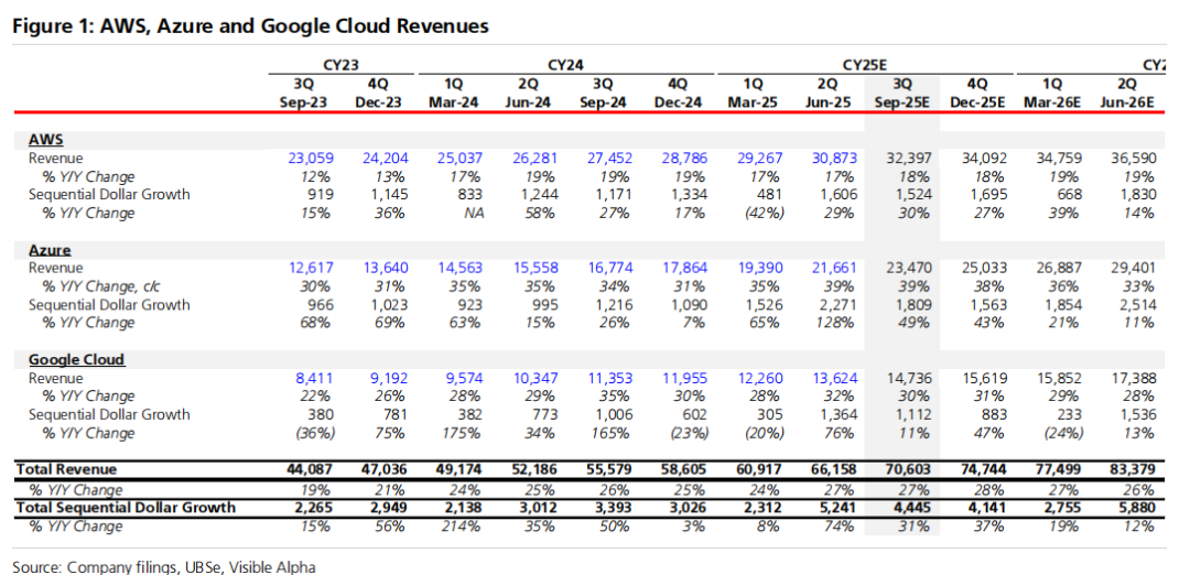 我们估计,投资者对三大云服务商2025年第三季度的增长率预期目标为:微软Azure 39%,亚马逊AWS 18%,谷歌云 35%。