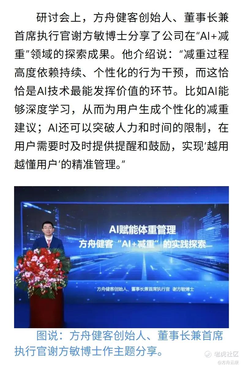 研讨会上,方舟健客创始人、董事长兼首席执行官谢方敏博士分享了公司在“AI+减重”领域的探索成果。他介绍说:“减重过程高度依赖持续、个性化的行为干预,而这恰恰是AI技术最能发挥价值的环节。比如AI能够深度学习,从而为用户生成个性化的减重建议;AI还可以突破人力和时间的限制,在用户需要时及时提供提醒和鼓励,实现‘越用越懂用户’的精准管理。”
