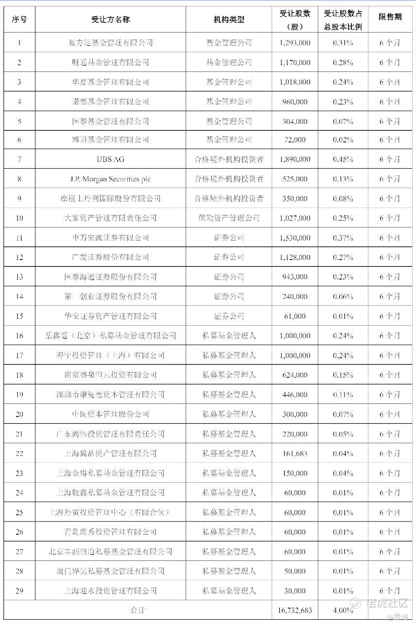 一共有29家基金接盘,其中,易方达基金管理有限公司认购1,293,000股,财通基金管理有限公司认购1,170,000股;