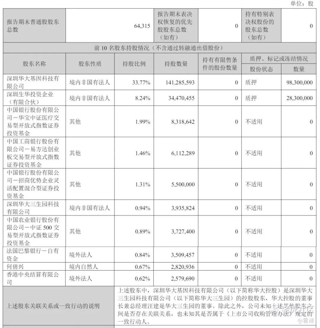 截至2025年6月30日,深圳华大基因科技有限公司持股为33.77%,深圳前海华大基因投资企业(有限合伙)持股为8.24%;