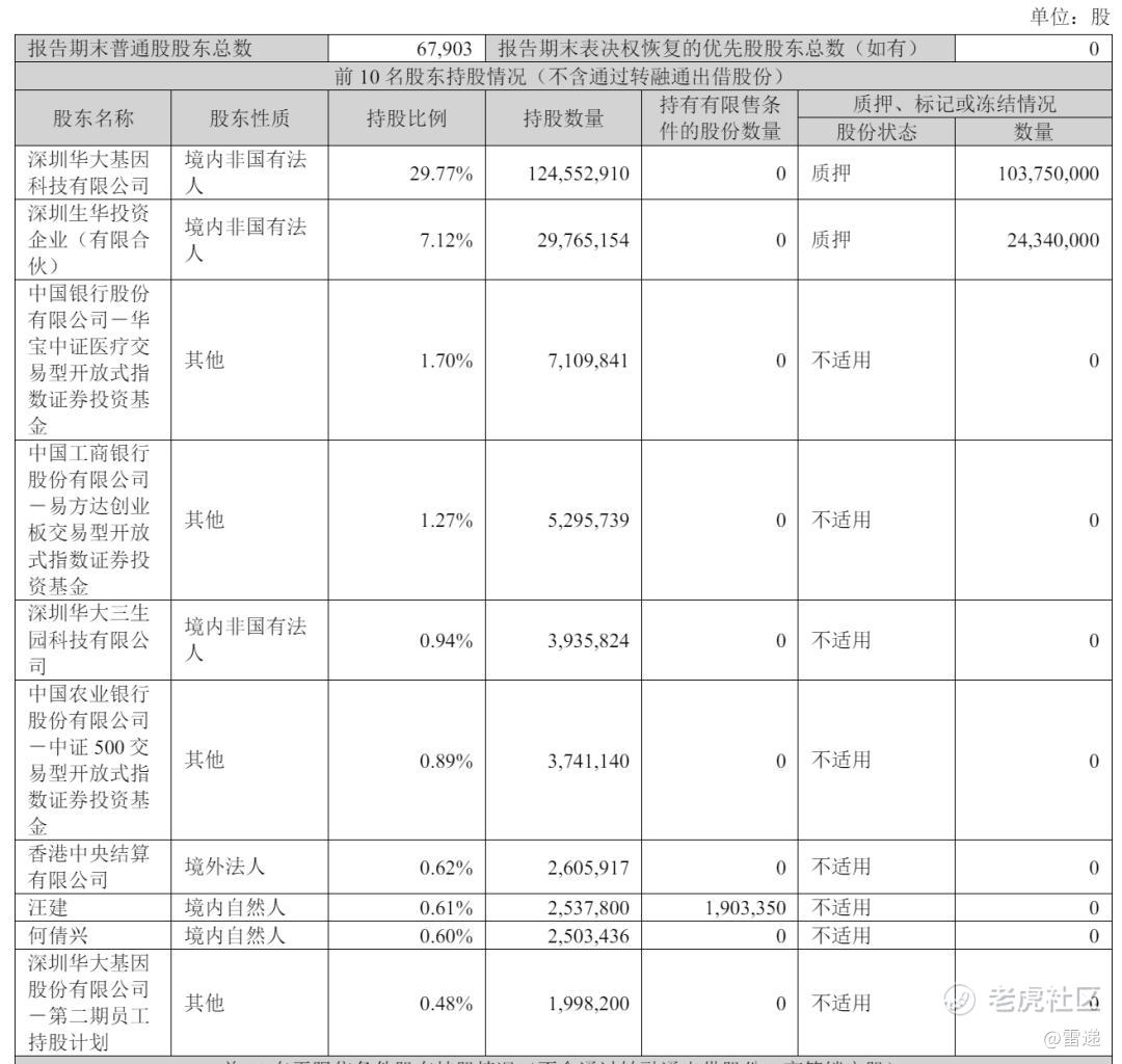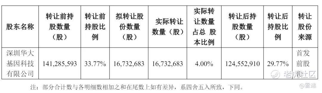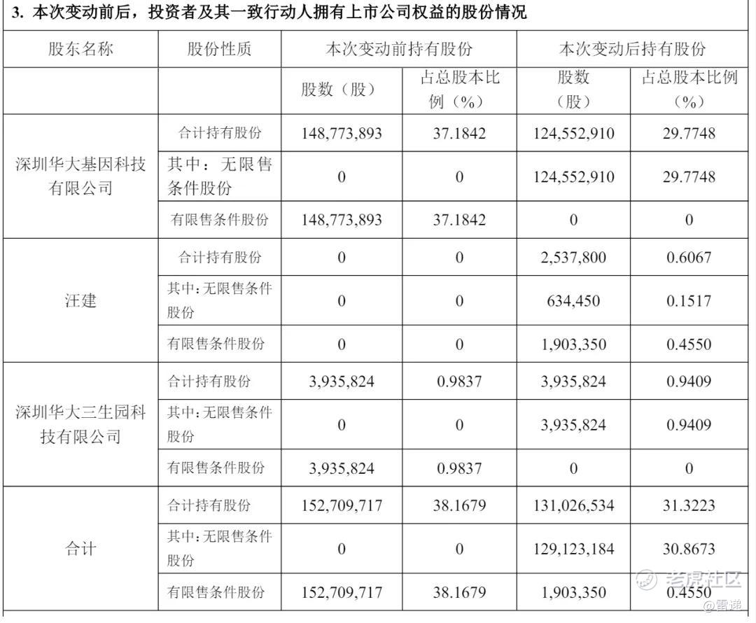 减持后,华大控股持股29.7748%,华大基因创始人汪健直接持股为0.6067%,深圳华大三生园科技有限公司持股为0.9409%。