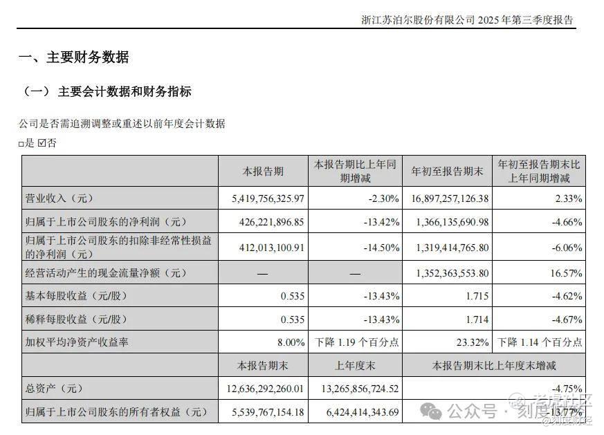 10月23日晚间,苏泊尔最新财报显示,本季度实现营业收入54.2亿元,同比下降2.3%。盈利质量的下滑更为显著,归属于上市公司股东的净利润4.26亿元,同比下降13.42%,扣非后净利润4.12亿元,降幅扩大至14.50%。